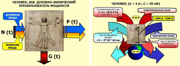 Если «бездыханные тела» (закрытые системы) работают под началом закона сохранения энергии с размерностью [L5T-4], то биотические и познавательные процессы (открытые системы) - под началом закона сохранения мощности[2] с более высокой пространственно-временной размерностью [L5T-5]. Но это означает, что космическое пространство (L) и время (T) служат неисчерпаемым источником мощности Земли, являющейся электромеханическим преобразователем мощности.
