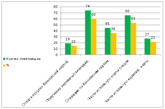 Достаточно высок процент людей, использующих банковские карты (85%) и карты, дающие скидки (85%) и эти показатели выше, чем в других группах. Выше также процент тех, кто использует карты москвича (54%). Треть опрошенных (31%) используют карты страхования, что заметно выше показателей Интернет - группы (11%).