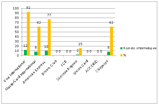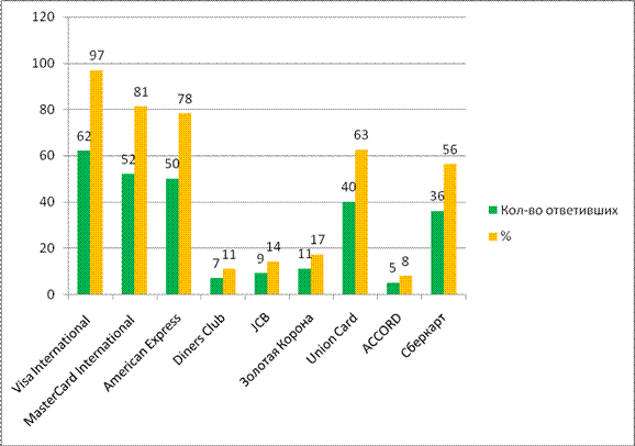 Анализ показывает, что из международных систем наиболее известны Visa International, MasterCard и AmEx, из национальных – Union Card и Сберкарт.
