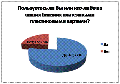 77% респондентов ответили, что они или их родственники пользуются платежными пластиковыми картами.