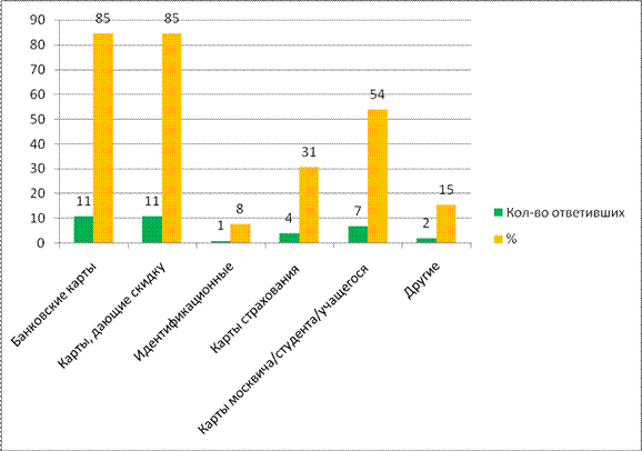 В отличие от респондентов Интернета, учащиеся Гимназии № 000 больше используют карты москвича и карты, дающие скидку, чем банковские, идентификационные и страхования.