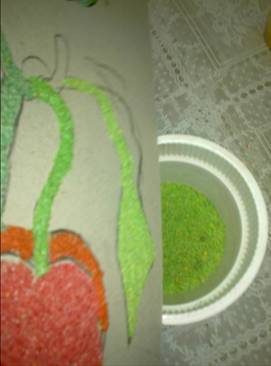 8. Нанести клей на внутреннюю часть рисунка. Заполнить манкой нужного цвета. (Приложение рис.2, 3 и 4)