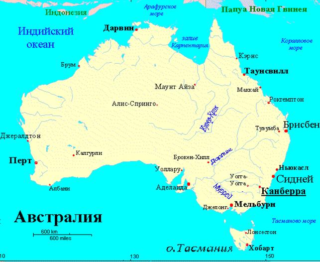 Новый Южный Уэльс, Виктория, Квинсленд, Южная Австралия, Тасмания, Западная Австралия — и 2 территории : Северная территория, Австралийская Столичная территория. Территория страны составляет 7682 тыс. кв. км, расположена на Австралийском материке, о. Тасмания и другими островами.