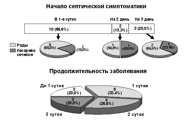 В результате изучения анамнеза и клинических данных 15 случаев женщин, умерших от сепсиса в родах, были выявлены следующие особенности: преобладали женщины в возрасте 30-40 лет – 6 случаев (40,0%), в анамнезе – 3 беременности –,6%), 3-и роды – 7 (46,6%). В 9 случаях (60,0%) отмечался преждевременный разрыв плодных оболочек с длительностью безводного периода в среднем 25-35 часов. Самостоятельные роды были в 11 случаях (73,3%), в 5 (33,3%) - наблюдалась первичная слабость родовой деятельности. В 6 случаях (40,0%) отмечалось плотное прикрепление плаценты, что потребовало ее ручного отделения и последующего кюретажа полости матки. Мертворождения встретились в 8 случаях (53,3%), в 50% из них диагностирована асфиксия с выраженной мацерацией кожных покровов. Начало и продолжительность заболевания представлены на рис. 1.