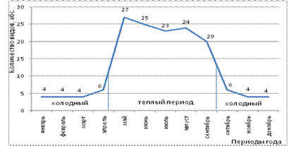 Наибольшее колебание числа видов наблюдается в конце холодного – начале теплого периода: от 4 оно изменяется до 30, а также с конца августа по конец сентября – с 33 видов вновь до 4. Весь холодный период года (октябрь – апрель) и в середине теплого периода (июнь-август) видовое разнообразие стабилизируется.