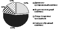 В населенных пунктах Чукотского нагорья выделено 4 комплекса синантропных птиц (рис. 5). Основу фауны составляют представители водно-околоводного комплекса (54,2% от общего состава авифауны). Значительна доля древесно-кустарниковых птиц – 23,7%, участие представителей других комплексов меньше: птиц тундровых пространств – 10,2%, скально-обрывных – 11,9% селитебной фауны.