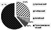 Обитающие в поселениях Чукотского нагорья птицы, по классификации (1938), являются представителями одного из четырех типов фаун (рис. 6): преимущественно состоят из транспалеарктов (61,1% синантропной фауны региона) с добавлением большой доли арктических видов (27,8%), незначительна доля представителей китайской и сибирской фаун (по 5,6%).