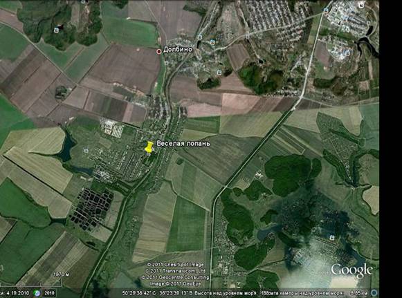 1.1. Актуальность темы. В течение последнего столетия в европейской части России произошли грандиозные по масштабам и интенсивности изменения ландшафтов, имеющие антропогенное происхождение. Увеличивающемуся населению необходима пища. Для этого человек, за счет природных ландшафтов, все больше и больше увеличивает сельскохозяйственные угодья. Распахиваются все более или менее пригодные земли, в следствие чего исчезают естественные степные территории. Для увеличения площади пахотных земель вырубаются леса, очаги которых остаются только в неудобьях и на охраняемых территориях. Все это отрицательно сказывается на биоразнообразии территорий. Сложные естественные биоценозы превращаются в упрощенные агроценозы с минимальным количеством представителей флоры и фауны. Снимок района наших работ с высоты птичьего полета является наглядным примером этому (рис. 1.1.1).