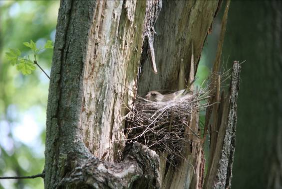 Зеленушка. 13 мая на участке №2 найдено гнездо, располагавшееся в расщепе ствола дерева на высоте 2,8 м (рис. 4.4.4). Полная кладка содержала 5 яиц. 20 мая в гнезде было 5 трехдневных птенцов. Все птенцы благополучно вылетели из гнезда.