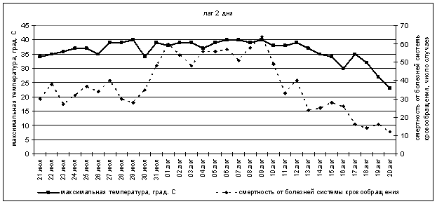Оценка связи между температурой воздуха и ежедневными случаями смерти проводилась с помощью метода временных рядов. Влияние экстремальной температуры воздуха на смертность населения изучалось с лагами 0, 1, 2, 3 дня. На рис.1 представлена суточная динамика количества смертей от болезней органов кровообращения и максимальной температуры в Воронеже с лагом в 2 дня.