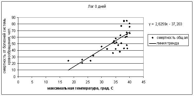 Рис. 2. Регрессионный анализ оценки зависимости между максимальной температурой воздуха и количеством смертей от болезней органов кровообращения в Воронеже (лаг 0 дней)