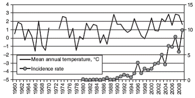 В Архангельской области среднегодовая температура между 1960 и 1989 годами колебалась от -1,5 до +2,6ºС и в среднем была +0,7ºС. За период с 2000 по 2009 годы среднегодовая температура воздуха была +2,0ºС. Синхронно с изменением температуры повысилась заболеваемость клещевым энцефалитом (рис. 5).
