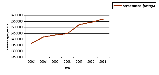 В 2005 г. в коллекциях музеев области хранилось 1364122 предмета, по итогам 2011 гпредметов. Средний рост увеличения музейного фонда области за шесть лет (2гг.) составил в среднем 34163 предметов в год. Третья часть всего музейного собрания области хранится в государственных музеях, две трети, соответственно, в муниципальных.