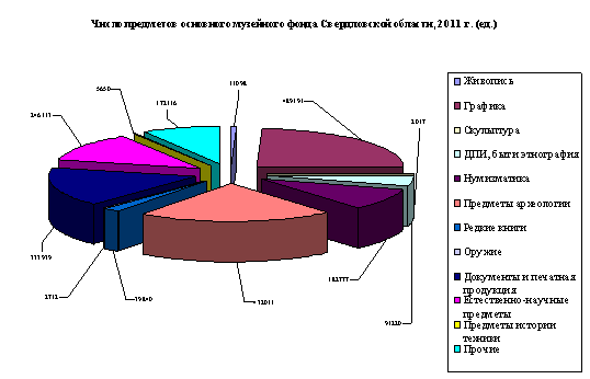 Число предметов научно-вспомогательного фонда на конец 2011 г. составило 611 541 ед., предметов, содержащих драгоценные металлы и камни - 22 395 ед. Из общего числа - предметы, являющиеся федеральной собственностью, переданные музею в оперативное управление или безвозмездное пользование - 228 129 ед. Ни один предмет из фондов музеев Свердловской области пока не включен в состав Музейного фонда Российской Федерации.