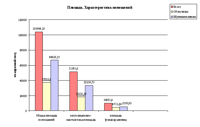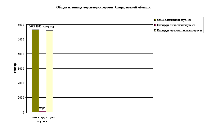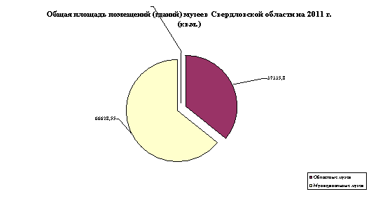 Общая площадь помещений музеев Свердловской области и закрепленных за ними территорий составляет 35 кв. м. и 5643,1911 га соответственно. Общая экспозиционно-выставочная площадь составляет 51591,8 кв. м., а площадь под хранение фондов – 10091,4 кв. м. Областные музеи занимают помещения общей площадью 37335,8 кв. м., на территории общей площадью в 69,84 га, экспозиционно-выставочная площадь составляет 18335,35 кв. м., площадь под хранение фондов 4711,64. Муниципальные музеи располагаются на территории в 5573,3511 га в помещениях общей площадью 66628,55 кв. м. Из неё 33256,73 кв. м. – экспозиционно-выставочная площадь и 5330,93 кв. м. – площадь под хранение фондов.