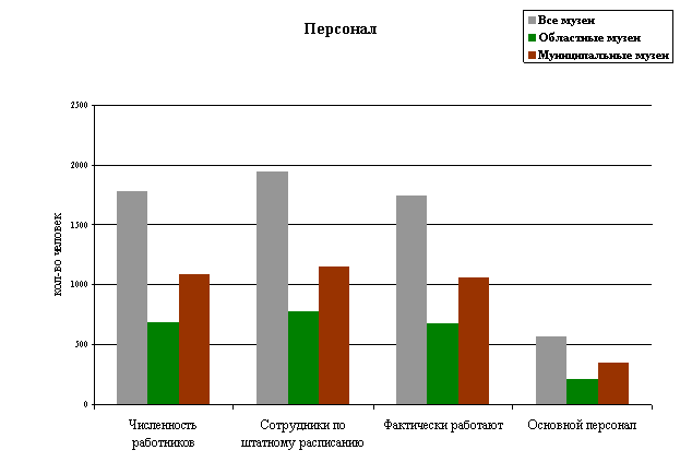 Динамика изменения численности музейного персонала отмечается в последние годы как положительная. Если за период гг. в целом по всей музейной сети число фактически работающих снизилось на 131 человека (7%), то за 5 последних лет ( гг.) – увеличилось на 190 человек (12,2 %). При этом фактический штат областных государственных музеев стал больше на 10%, а муниципальных – на 13%.