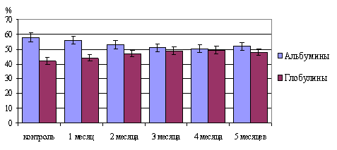 Рис. 1. Изменение содержания альбуминов и глобулинов в сыворотке крови при хроническом воздействии сероводородсодержащего газа в концентрации 3 мг/м3 по сероводороду (ммоль/л).