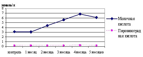 Рис.2. Изменение содержания молочной и пировиноградной кислот при хроническом воздействии сероводородсодержащего газа в концентрации 3 мг/м3 по сероводороду (ммоль/л).