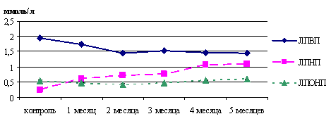 Рис. 3. Содержание липопротеидов высокой, низкой и очень низкой плотности в крови при хроническом воздействии сероводородсодержащего газа в концентрации 3 мг/м3 на концентрацию (ммоль/л).