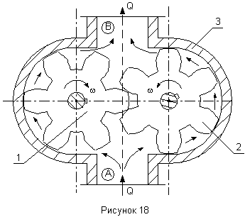Впадины между зубьями винтов заполняются жидкостью, которая при вращении винта переносится из всасывающей полости в нагнетательную.