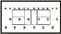 В процессе тренировки и игр на счет спортсмены теряют много жидкости. Не будет лишним, если на тренировку вы будет приносить с собой воду или соки для восстановления жидкости в организме. Методику обучения бадминтону можно разделить на следующие части: 1. Подготовка к обучению. Подготовка к обучению включает разнообразные подготовительные упражнения, развивающие чувство волана, подготавливающие мышцы и связки к выполнению основных упражнений, развивающие ловкость и быстроту. Здесь используются упражнения с воланом, ракеткой, воланом и ракеткой. На первых занятиях они индивидуальные, а затем, как правило, парные. Эти упражнения включаются в каждый урок и используются в разминке или в начале основной части занятия. Обучение технике включает подводящие и имитационные упражнения, сами приемы игры, а также упражнения на закрепление полученных навыков. Все эти упражнения входят в основную часть занятия. Обучение тактике. Учебные игры и упражнения на этапе закрепления техники. Совершенствование включает более сложные упражнения с воланом и ракеткой, имитационные упражнения по сигналам, отработку отдельных приемов игры и тактических комбинаций, учебные и соревновательные игры, развитие силы и быстроты работающих мышц. Все эти упражнения, за исключением соревновательных игр, входят в основную часть занятия. Соревновательные игры выносятся за сетку часов и проводятся во внеурочное время. Проведение таких игр по бадминтону (как, впрочем, и по другим видам спорта) во время уроков крайне нерационально, так как занимает много времени при малом количестве участников. Структура урока на занятиях бадминтоном следующая. Разминка. Равномерный бег или подвижная игра с бегом в течение 6 минут. ОРУ, упражнения с воланом, ракеткой или воланом и ракеткой. Основная часть. Включает обучение, закрепление и совершенствование техники и тактики игры, а также развитие физических качеств. Она должна строиться с учетом возможностей учащихся. Заключительная часть. Спокойные упражнения (например, подача на технику или на точность). Собирают (сдают) ракетки и воланы. Снимают, если необходимо, сетки. Подведение итогов занятия. Расположение учащихся в зале при обучении бадминтону рекомендуется следующее. Практически все упражнения по бадминтону удобно проводить в парах. При этом учащихся располагают одним из двух способов. 1. По боковым линиям бадминтонной площадки, расположенной в середине. При этом один ученик из пары встает с одной стороны, а другой – с противоположной. Расстояние между учащимися в шеренге – 1,5–3 м. При выполнении некоторых индивидуальных упражнений учащиеся одной из шеренг (выполняющие в данный момент упражнение) могут располагаться в шахматном порядке, чтобы не мешать друг другу (рис. А: находящиеся друг напротив друга крестик и нолик составляют одну пару).