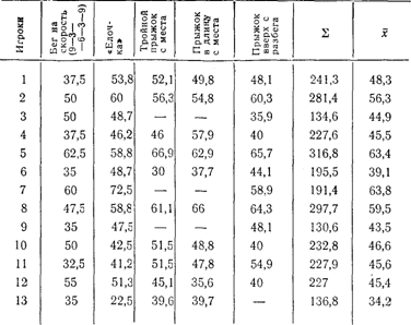 а — стандартное отклонение. Рассмотрим на конкретном примере порядок расчетных операций при выведении обобщенной оценки. Волейболисты одной из команд тестировались по следующим тестам: 1) «елочка», 2) 9—3—6—3—9, 3) тройной прыжок с места, 4) прыжок в длину с места, 5) прыжок вверх с разбега. В табл. 2 представлены их результаты прыжка вверх с разбега, толчком обеих ног, а также оценки в баллах. Они получены следующим образом: а) рассчитывается средняя арифметическая по фор-