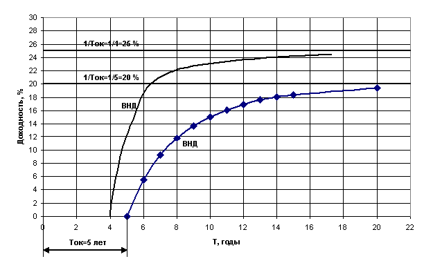 Из рис. 3 видно, что бесконечным может считаться период в 3 – 4 раза больший по сравнению с простым сроком окупаемости.