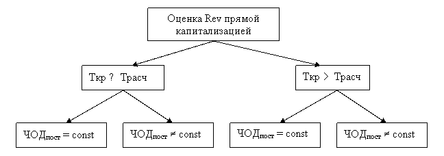 В современной теории оценки определение величины Rev предлагается осуществлять тремя способами: 1. Экспертной оценкой цены продажи, основываясь на рыночных тенденциях, мнениях профессионалов рынка, аналитических материалах, публикуемых в специализированных изданиях. Из-за не высокой доказательности данного способа здесь нами рекомендуется применение, во-первых повышенной нормы дисконта и, во-вторых, интервального метода (метода граничных оценок), с помощью которого можно определить наиболее вероятные минимальное и максимальное значения, как Rev, так и Е. 2. Прямой капитализацией всех постпрогнозных доходов. Здесь возможны несколько вариантов (рис. 5): во-первых, когда погашение кредита будет завершено до окончания расчетного периода (Ткр ≤ Трасч), во-вторых, когда на дату завершения расчетного периода останется невыплаченный остаток кредита. В первом случае цена Rev равна капитализированной величине постпрогнозных ЧОД, при условии, что коэффициент капитализации будет равен норме дисконта для постпрогнозного периода (Епост): |