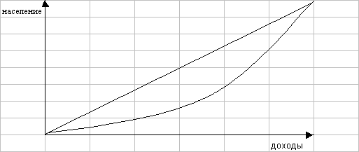 Связанным с кривой Лоренца показателем дифференциации доходов является коэффициент Джини, рассчитываемый как отношение ограниченной кривой Лоренца площади к площади треугольника ОХY. В условиях равномерного распределения доходов коэффициент Джини.