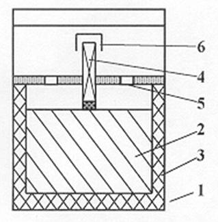 1.Корпус генератора; 2.Пиротехнический (аэрозолеобразующий) заряд; 3.Теплоизолирующий материал; 4.Узел запуска; 5.Сопловое отверстие; 6.Защитный колпачек
