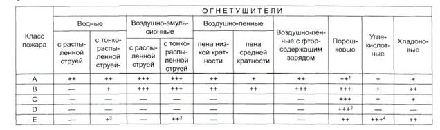 Знаком +++ отмечены огнетушители, наиболее эффективные при тушении пожара данного класса; ++ огнетушители, пригодные для тушения пожара данного класса; + огнетушители, недостаточно эффективные при тушении пожара данного класса; — огнетушители, непригодные для тушения пожара данного класса.