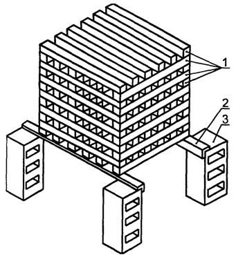 Модельный очаг пожара класса А представляет собой деревянный штабель в виде куба (рис. 1). Штабель размешают на твердой опоре (например, на двух стальных уголках, установленных на бетонных блоках) таким образом, чтобы расстояние от основания штабеля до опорной поверхности (пол или земля) составляло (400±10) мм. Размеры опоры определяют в соответствии с размерами модельного очага пожара, но не менее длины бруска, указанной в таблице 1.