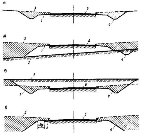 а - в нулевых отметках планировки территории; б - при планировке территории подсыпкой; в - при планировке территории срезкой; г - с уширением проезжей части в строительный период; 1 - проектная линия I этапа строительства; 2 - естественный рельеф территории; 3 - проектная линия II этапа строительства; 4 - контур земляных работ II этапа строительства; 5 - уширение проезжей части в строительный период; 6 - покрытие дороги