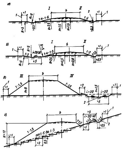 а - насыпей с треугольными кюветами; б - то же, с трапецеидальными кюветами; в - насыпей высотой до 8 м; г - насыпей на косогорах с уклоном от 1 : 5 до 1 : 3, в том числе: I - обтекаемый профиль; II - необтекаемый профиль; III - в случае возведения насыпи из привозного грунта; IV - то же, из боковых резервов; 1 - граница полосы отвода; 2 - забанкетная канава; h - глубина резерва; Н - высота насыпи; R - радиус сопряжения на профиле дороги