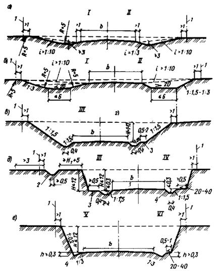 а - глубиной до 1 м - раскрытые; б - глубиной до 1 м - разделанные под насыпь; в - глубиной до 12 м в песчаных и глинистых грунтах; г - то же, в обломочных осыпающихся грунтах; д - то же, в лессовых и лессовидных грунтах; е - то же, в скальных монолитных слаботрещиноватых грунтах, в том числе: I - с обтекаемым поперечным профилем; II - необтекаемым профилем; III - при косогорной местности; IV - на ровных участках; V - в скальных невыветривающихся грунтах; VI - в слабовыветривающихся грунтах; 1 - граница полосы отвода; 2 - нагорная канава; 3 - полка; 4 - кювет; L - уклон; Н - высота насыпи; R - радиус сопряжения поверхности на профиле