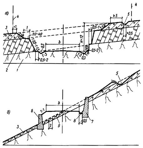а - выемка в скальных грунтах различных свойств и залегания пластов; б - полунасыпь-полувыемка с подпорной и одевающей стенками; 1 - скальный грунт крупноблочный слабовыветривающийся; 2 - скальный грунт мелкоблочный легковыветривающийся; 3 - суглинисто-щебенистый грунт; 4 - граница полосы отвода; 5 - нагорная канава; 6 - подпорная стенка; 7 - одевающая стенка; 8 - открытый лоток с укрепленным дном; 9 - уступы; Н - высота насыпи