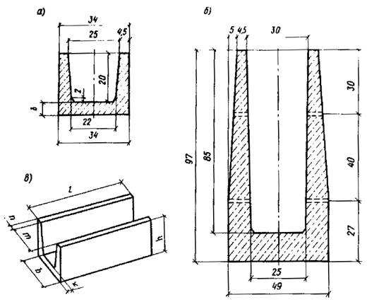 а - глубиной 0,2 м с глухими стенками; б - то же, глубиной 0,85 м с дренажными отверстиями в стенках; в - блок безраспорного лотка