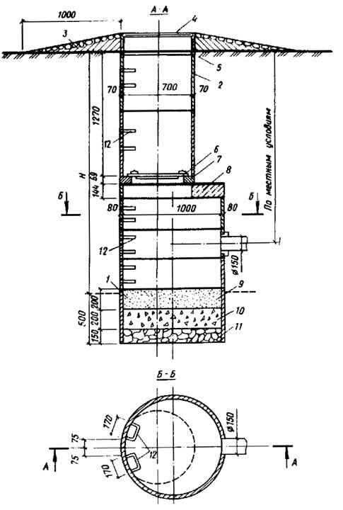 1 - верх поглощающего слоя; 2 - железобетонные кольца; 3 - отмостка из булыжного камня или из железобетонных плит; 4 - чугунный люк; 5 - регулировочные бетонные камни; 6 - деревянная крышка; 7 - опорное кольцо; 8 - плита перекрытия; 9 - песок крупный; 10 - щебень; 11 - камень; 12 - скобы ходовые