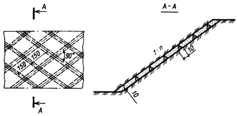 обсев откосов травами в клетках из бетонных брусков (рис. 57);