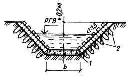 1 - щебень с песком толщиной слоя 0,08 - 0,1 м; 2 - деревянные колья для крепления дернины; b - ширина подошвы канавы по расчету; РГВ - расчетный горизонт воды