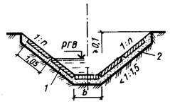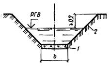 1 - бетонная плита; 2 - подстилающий песчаный слой толщиной 0,2 м; РГВ - расчетный горизонт воды; b - ширина дна канавы по расчету