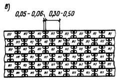 2.219. Геотекстиль следует укладывать на глинистые грунты основной площадки земляного полотна, спланированной в обе стороны от оси пути с уклоном не менее 0,04 ‰. Материал размещают по всей ширине основной площадки земляного полотна. Минимальная толщина балластного слоя (песчаная подушка, щебень или асбестовый балласт) поверх геотекстиля должна быть не менее 0,3 м (рис. 69, а).