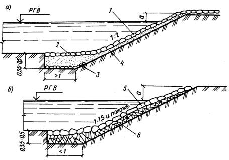 а, б - камнем различных размеров в поперечнике; 1 - камень размером 0,15 - 0,2 м; 2 - то же, 0,18 - 0,2; 3 - то же, 0,12 - 0,18; 4 - слой песка или щебня; 5 - слой камня размером 0,25 м; 6 - щебень или гравий 0,1 - 0,15 м; а - высота набега волны и подпора около водопропускных сооружений; РГВ - расчетный горизонт воды