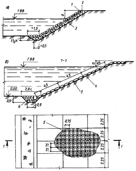 2.225. Для защиты постоянно затопляемых откосов насыпей и естественных склонов следует проектировать каменные наброски, фашины, габионы (рис. 72, а), а при отсутствии в районе строительства указанных материалов можно использовать геотекстиль, прикрываемый сверху гибким ковром из плит (рис. 72, б).