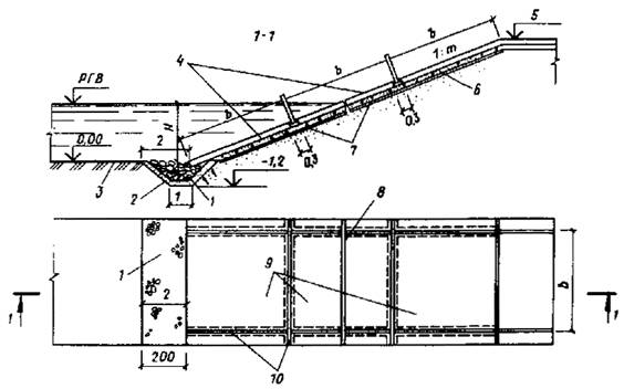 1 - упорная призма из камня; 2 - песок крупнозернистый; 3 - поверхность дна водоема; 4 - плиты железобетонные; 5 - отметка верха крепления откоса; 6 - подстилающий слой из щебня и гравия; 7 - плиты сборные железобетонные; 8 - температурно-усадочный шов; 9 - плиты железобетонные монолитные; 10 - конструктивные швы; РГВ - расчетный горизонт воды; b - ширина плиты