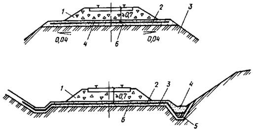 Рис. 69. Конструкции насыпи и выемки на увлажненных грунтах основной площадки и кюветов с укладкой геотекстиля