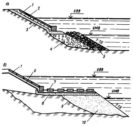 а - из каменной наброски и фашин; б - с применением геотекстиля, прикрытого гибким ковром из плит; 1 - железобетонные плиты толщиной 0,07 - 0,1 м; 2 - выравнивающий слой из щебня толщиной 0,1 - 0,15 м; 3 - подстилающий слой из песка 0,2 - 0,3 м; 4 - каменная наброска; 5 - фашины; 6 - геотекстиль; 7 - гибкий ковер из плит; 8 - выравнивающий песчаный слой; 9 - поверхность откоса после размыва; 10 - намывной слой песка; УВВ - уровень высоких вод; УМВ - уровень меженных вод