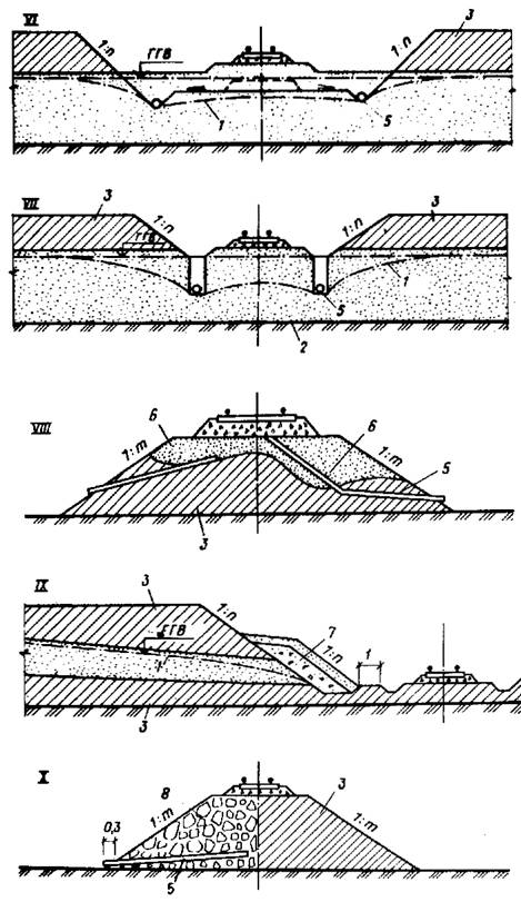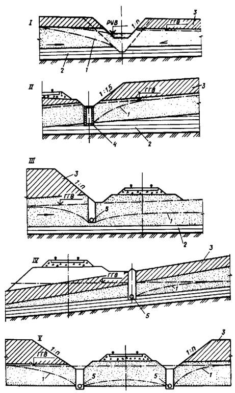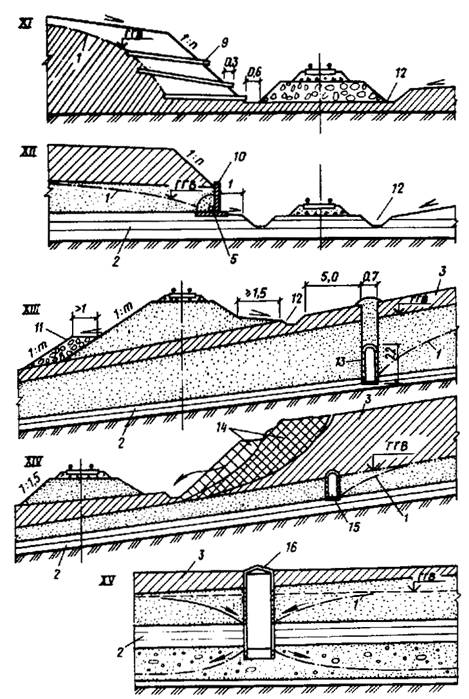 1 - депрессионная кривая; 2 - водоупорный слой из глины; 3 - суглинок; 4 - железобетонный лоток; 5 - дренаж; 6 - балластный мешок; 7 - прислоненный дренаж; 8 - контрфорсный дренаж; 9 - шпуровой дренаж в скальных грунтах; 10 - застенный дренаж с обратным фильтром; 11 - берма; 12 - канава; 13 - галерея; 14 - оползень; 15 - штольня; 16 - поглощающий колодец; ГГВ - горизонт грунтовых вод