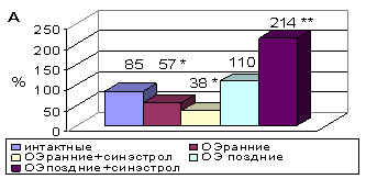 Эстрогенизация синэстролом в ранних сроках после овариоэктомии восстанавливала спектр действия диазепама в КС до уровня интактных самок в утренние часы. При МПТ на фоне гормона усиливалось «седативное» и «противотревожное» влияние диазепама, при этом выраженность эффектов была больше, чем у интактных крыс. Однако в ОП на фоне эстрогенизации ослаблялось «противотревожное» и усиливалось активирующее действие диазепама.