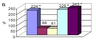А – диазепам 0,1 мг/кг; Б – диазепам 0,5 мг/кг. По оси абсцисс – столбцы: первый – интактные; второй – ОЭ и третий – эстрогенизированные ОЭ самки в ранних сроках кастрации; четвертый – ОЭ и пятый – эстрогенизированные ОЭ самки в поздних сроках кастрации. По оси ординат – в % изменения частоты взятий воды по сравнению с контрольными данными, соответственно, интактных и ОЭ самок, получавшими раствори%). * – при Р < 0,05; ** – при Р < 0,01.